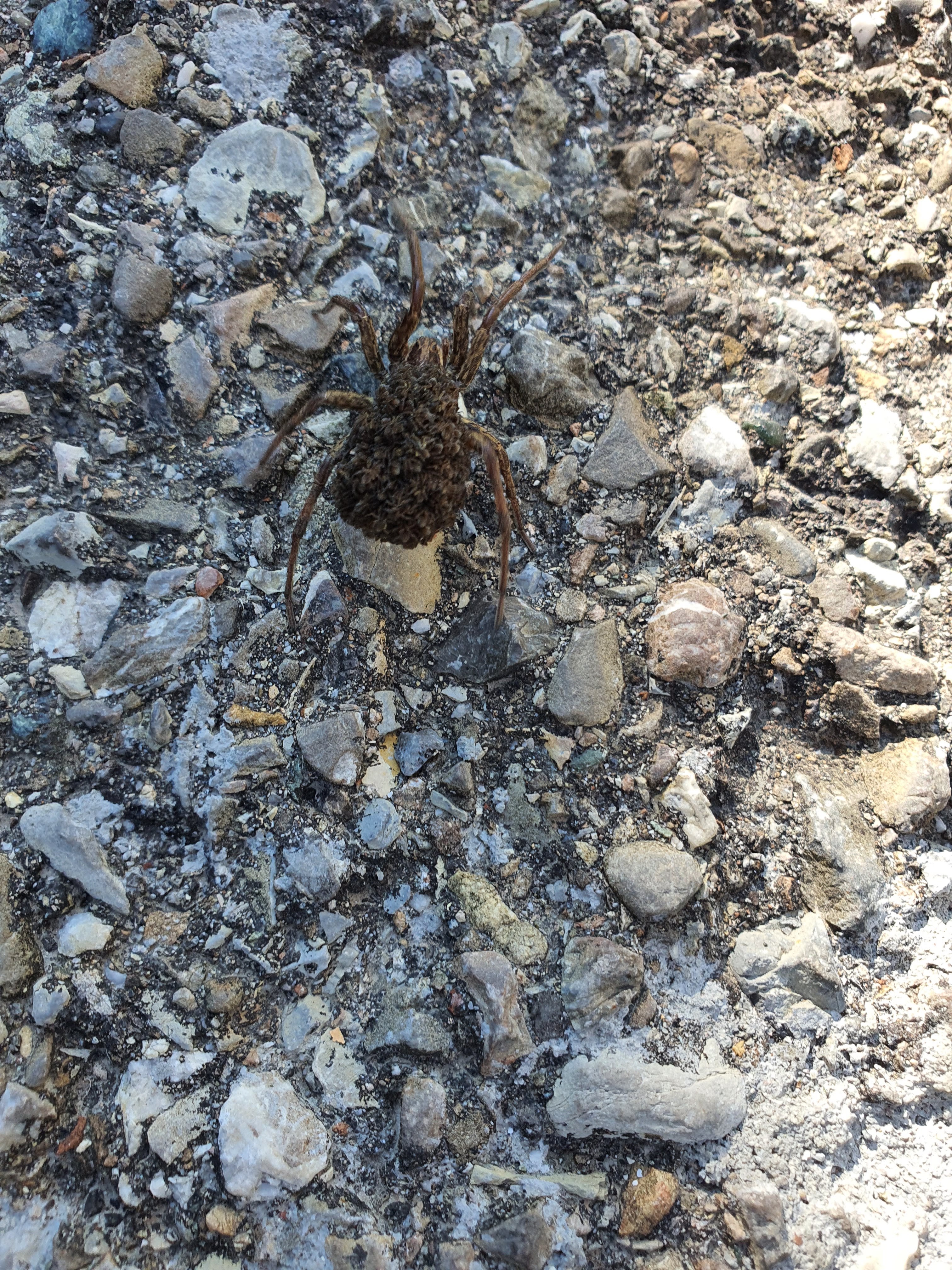 Lähes neljäsenttimetrinen juoksuhämähäkki, joka kantoi poikasia selässään.