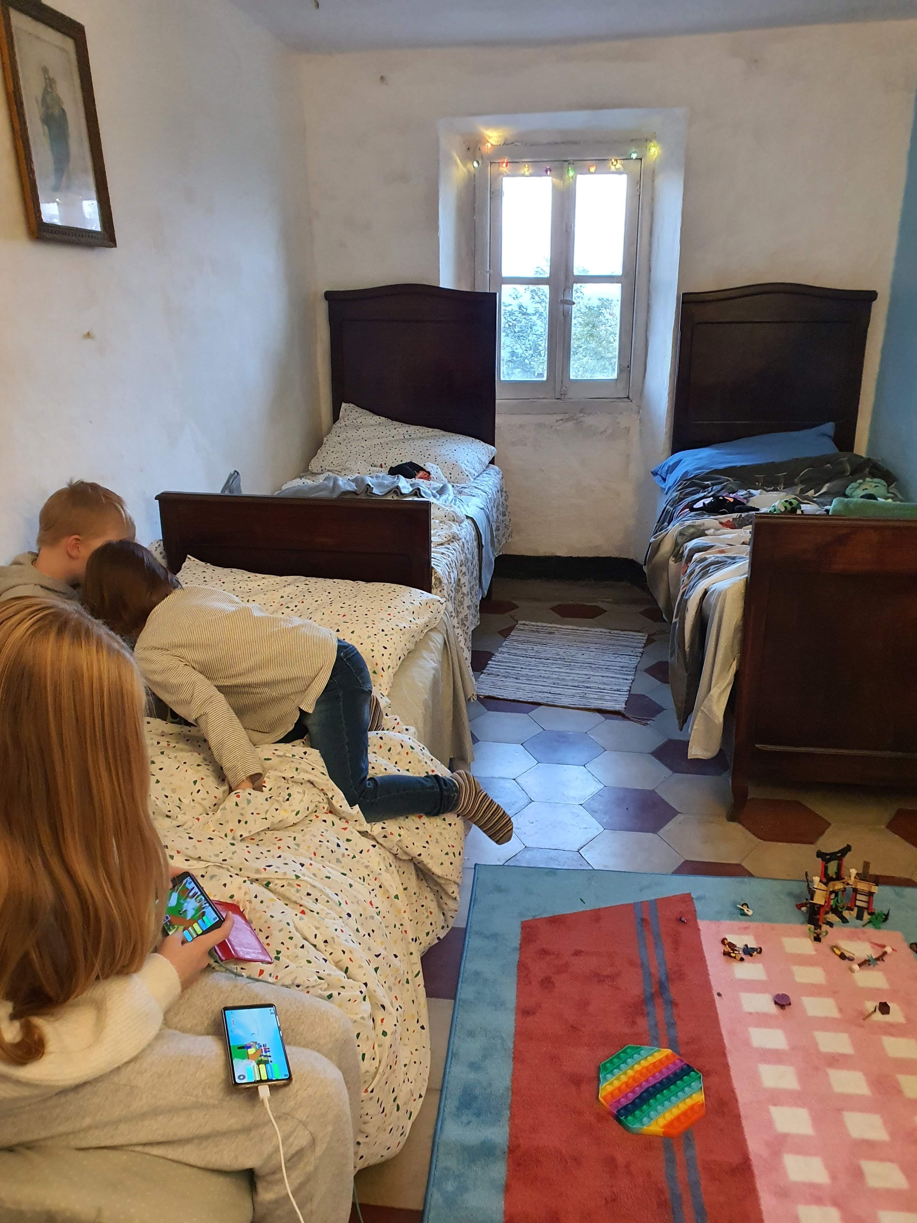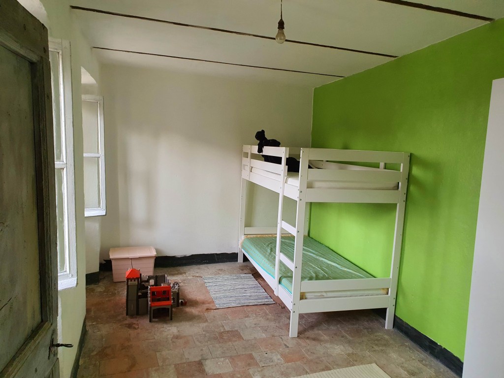 Siskon perheen saapumisen jälkeen oli ohjelmassa tietenkin hiukan hyperaktiivinen kierros talossa. Talo oli kuulemma parempi kuin kuvissa ja kaikki tulijat vaikuttivat innostuneilta ja hyväksyviltä. Sain vihdoin huokaista. Siskon lapsille (7- ja tuolloin melkein 10 -vuotiaat) sekä minun nuorimmalleni oli varattu kolmannen kerroksen ainoa valmistunut huone. Siellä oli kolme sänkyä, matto, jalkalamppu, patteri sekä erikoinen viritys yläkerran ainoasta pistorasiasta vedettyä jatkojohtoa. Lapset olivat kuitenkin innostuneita omasta valtakunnastaan.