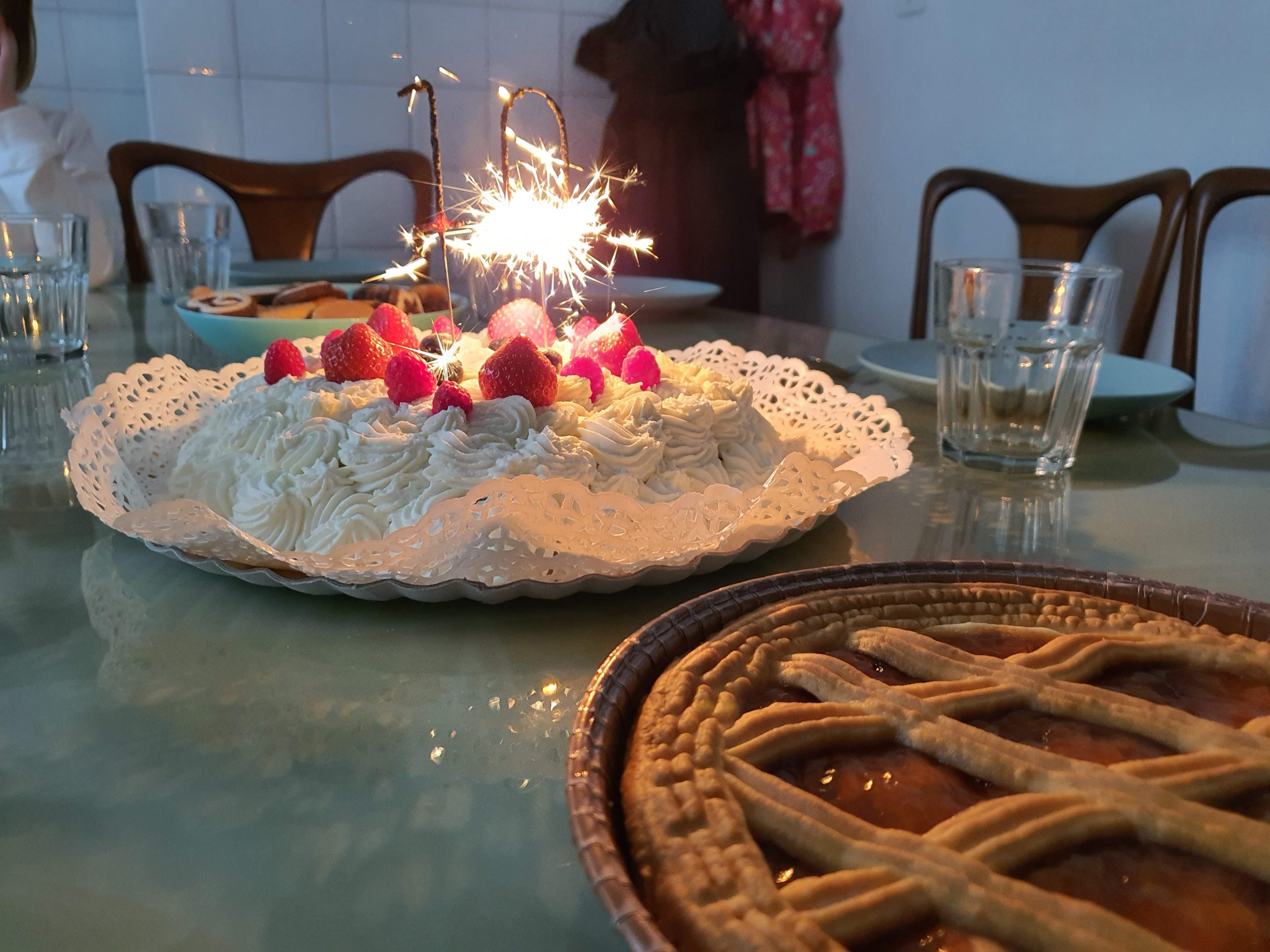 Mietimme siskon kanssa, mitä voisimme tehdä Corradolle ja hänen perheelleen kiitokseksi kaikenlaisesta pienestä vaivannäöstä. Päädyimme lohipiirakkaan. Ajattelin, ettei täytteeseen tarvittavaa Creme Fraichea saanut kaupoista, vaikka myöhemmin näin sitä meidän Iperin kylmähyllyssä. Korvasimme täytteen hapankerman rahkalla, jota löytyi Lidlistä ja laitoimme lisäksi kananmunaa, kermaa, kylmäsavulohta ja pippuria. Tilliä emme alkaneet etsimään mistään, vaikka sitä kasvaa kyllä villinä teiden varsilla. Kaupassa en kuitenkaan ole koskaan nähnyt tilliä, ja luulen sen makuna olevan italialaisille aika eksoottinen. Teimme piirakan kertakäyttöfoliovuoassa ja paistoimme sen uunissa napsutellen samalla sulaketta päälle. Piirakka näytti ihan hyvältä, pakkasime sen komeaan synttärikakun pakkaukseen ja veimme naapureille. Myöhemmin Corradon vaimo kehui piirakkaa kovasti. Toivottavasti se oli syötävää.
