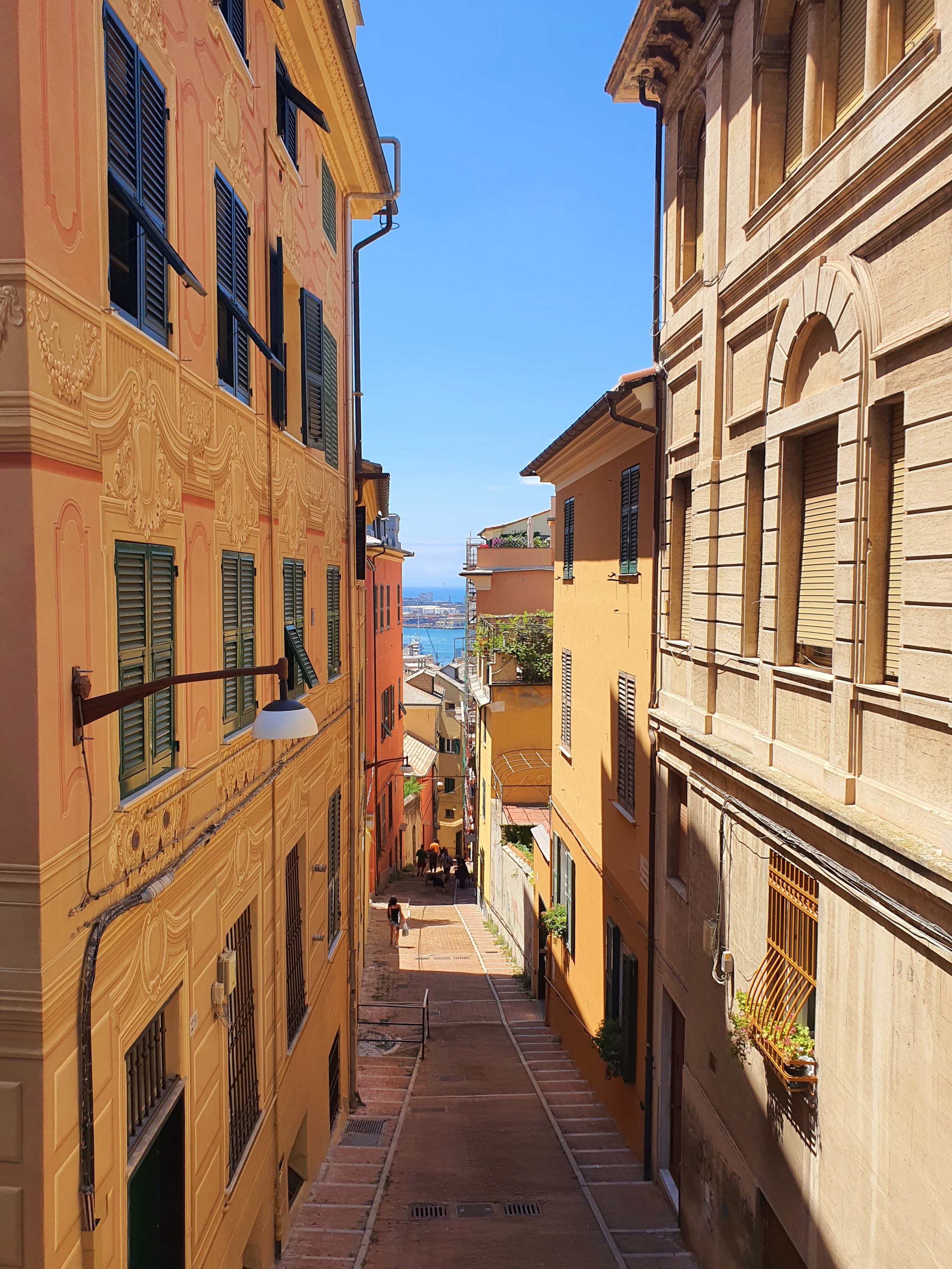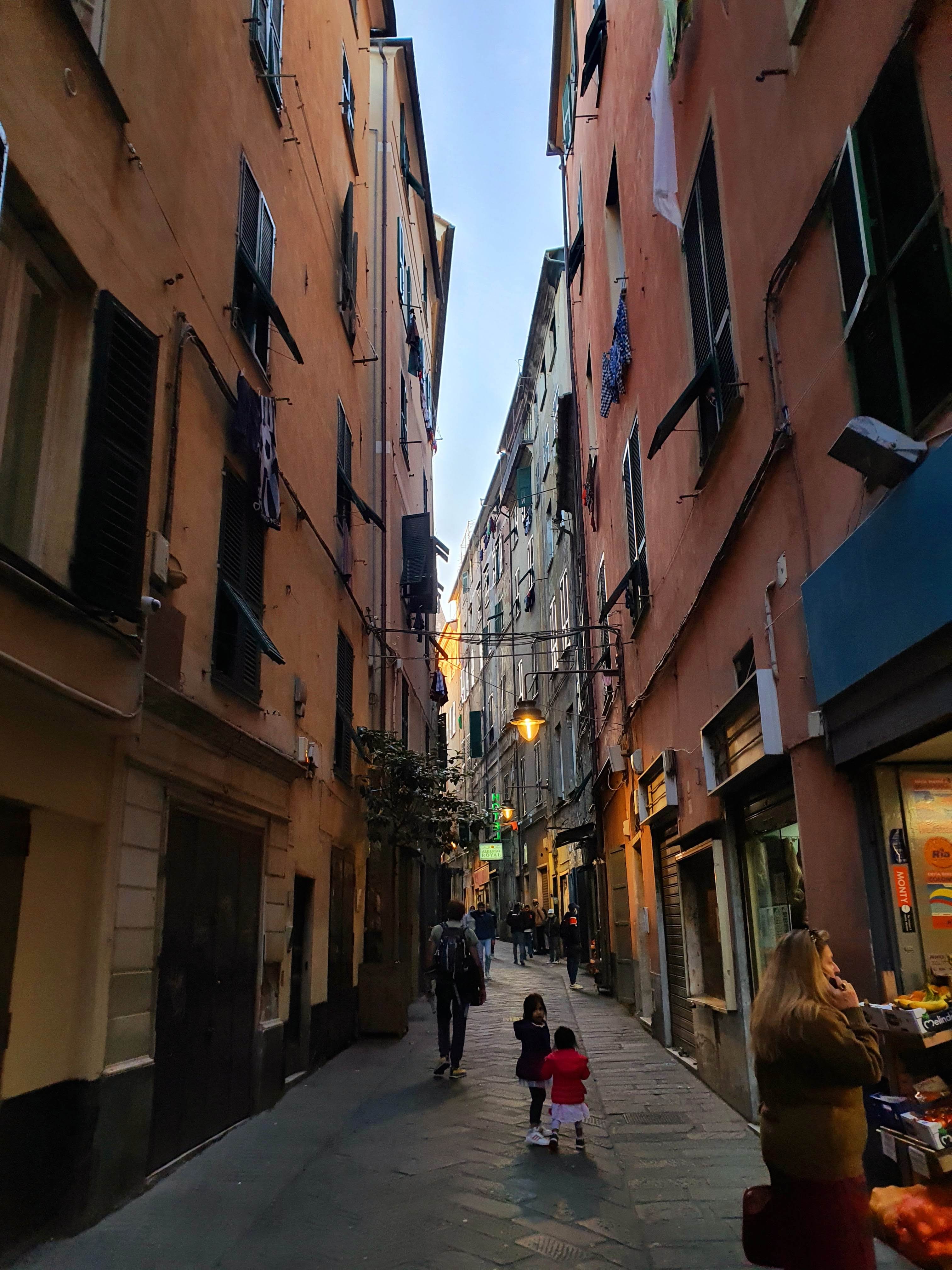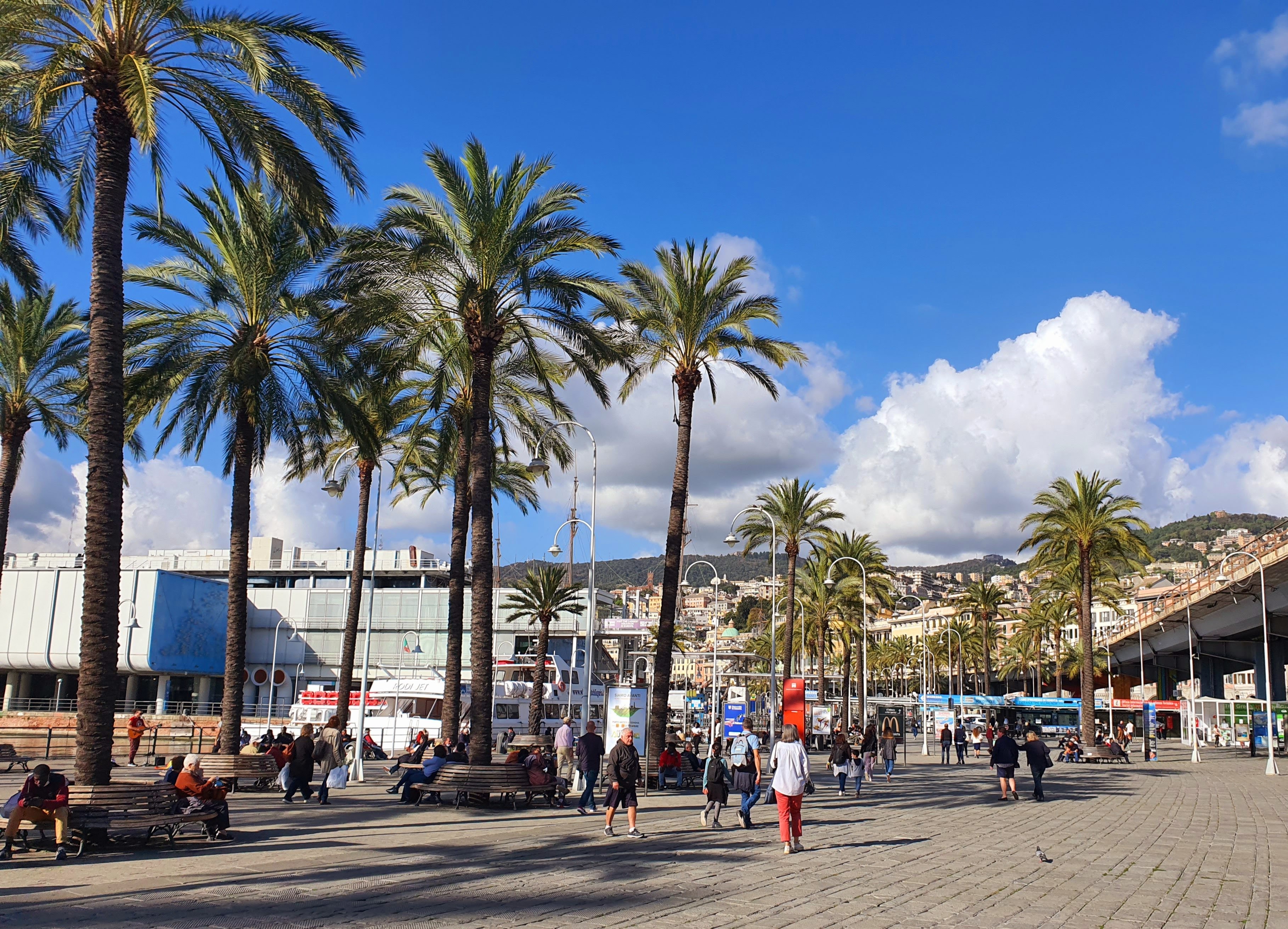 Kävimme kuitenkin vielä junalla myös Genovassa ja vaikka taas juna oli vähän myöhässä, oli matkanteko näin rennompaa. Genovassa kävimme akvaariossa ja saimme taivuteltua lapset kävelemään noin kilometrin takaisin juna-asemalle. Meren rannan suuntaisesti kulkeva sivukatu näytti minulle toisenlaista, hyvin värikästä Genovaa.