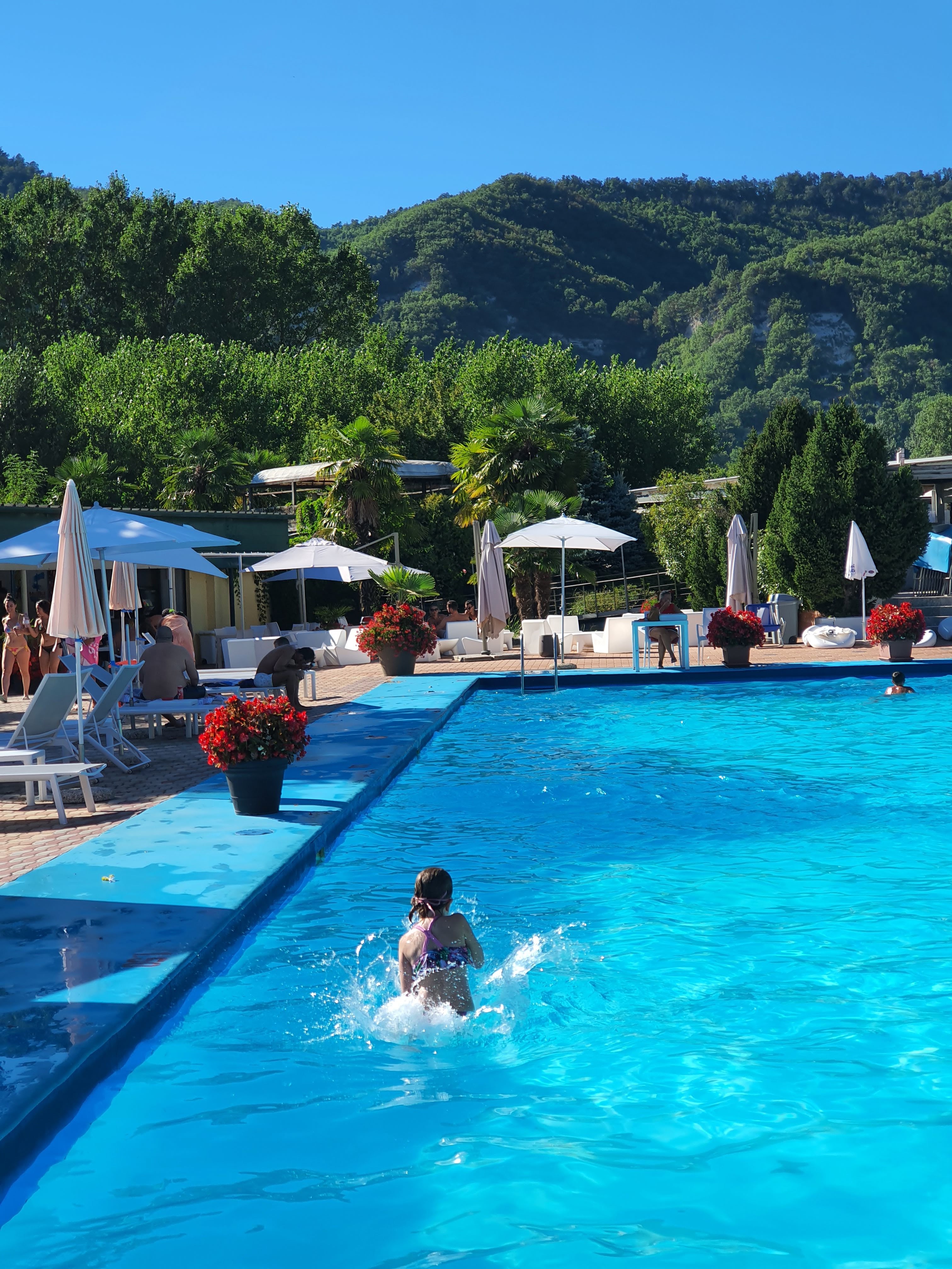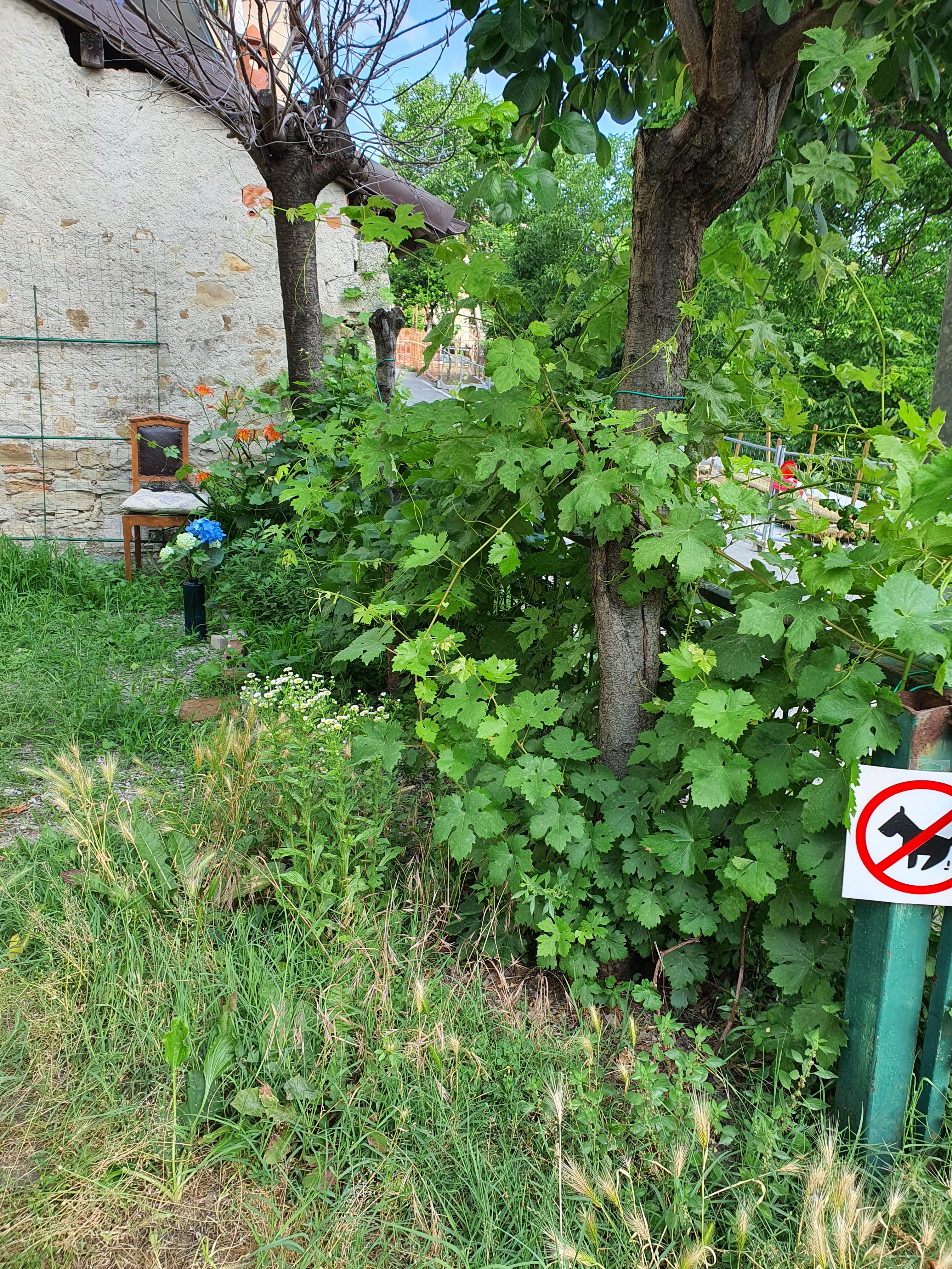 Corrado on ihastellut työntekoamme ja viihtyisää pientä pihaamme. Italialaiseen tapaan kaikki on bellissima. Sitten hän esitteli minulle omaa pihaansa, jonka parissa on kevään ahkeroinut. Hän oli rakentanut uima-altaan, valanut sille pohjan ja rakentanut ympärille kävelytason. Heidän pihansa on rinteeseen porrastettuna, uima-allas on keskimmäisellä tasolla ja siitä on kaunis näkymä alas laaksoon. Alimmalla tasolla pihalla on suurehko hedelmätarha. Ylemmäs naapurimme on rakentanut terassin, tai oikeastaan valanut lattian ja asentanut siihen pergolan, jonka vieressä on baari. Menin aivan sanattomaksi nähdessäni koko komeuden, mikä ei välttämättä haittaa, sillä innostuessaan naapurini puhuu taukoamatta.