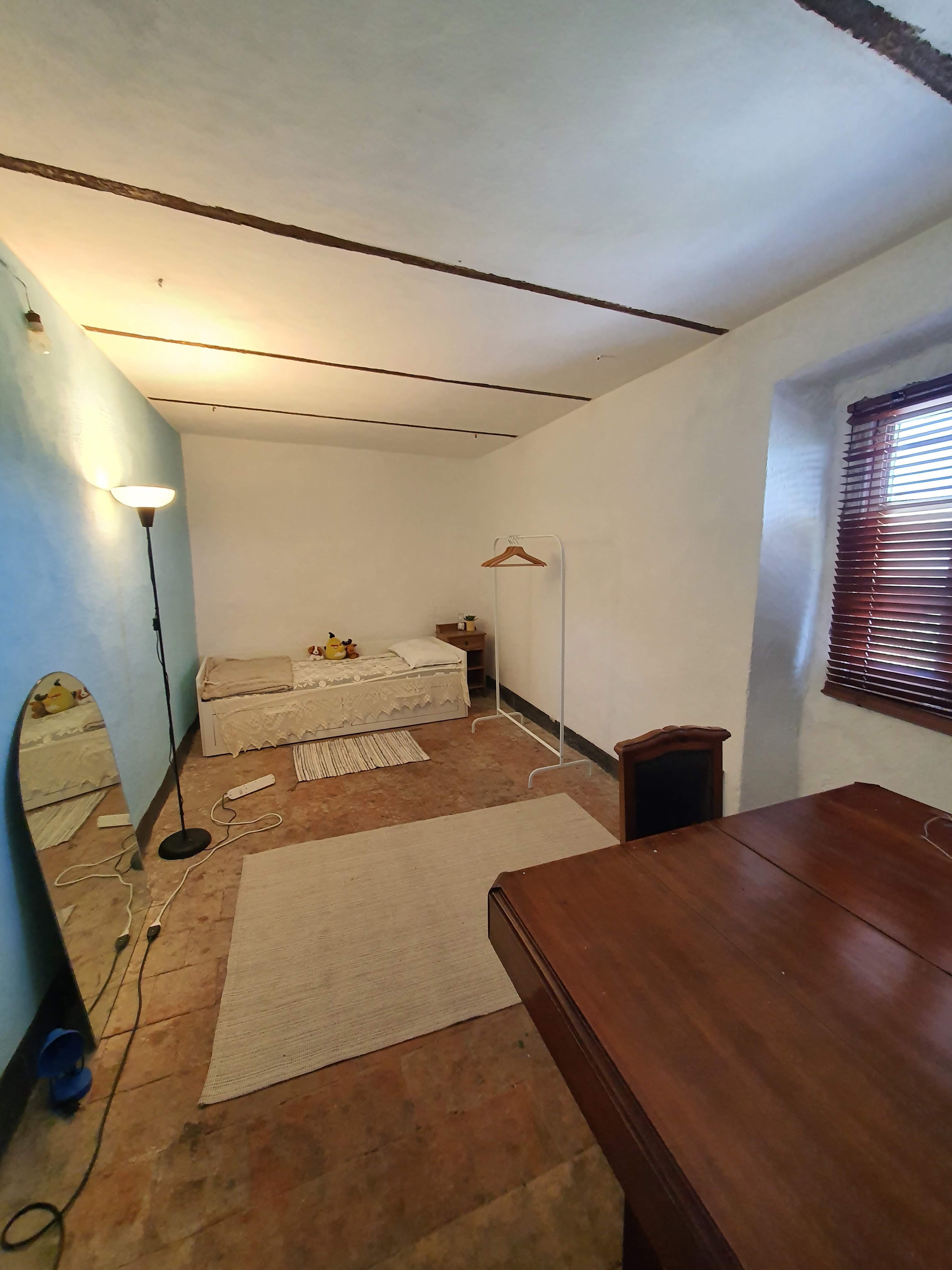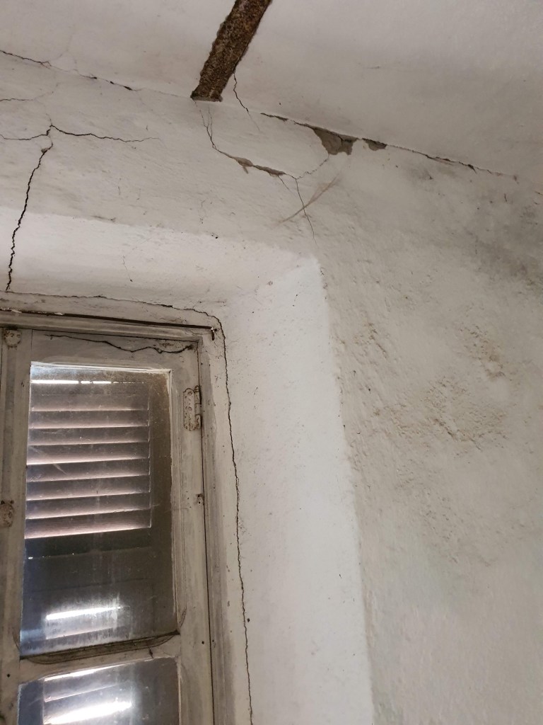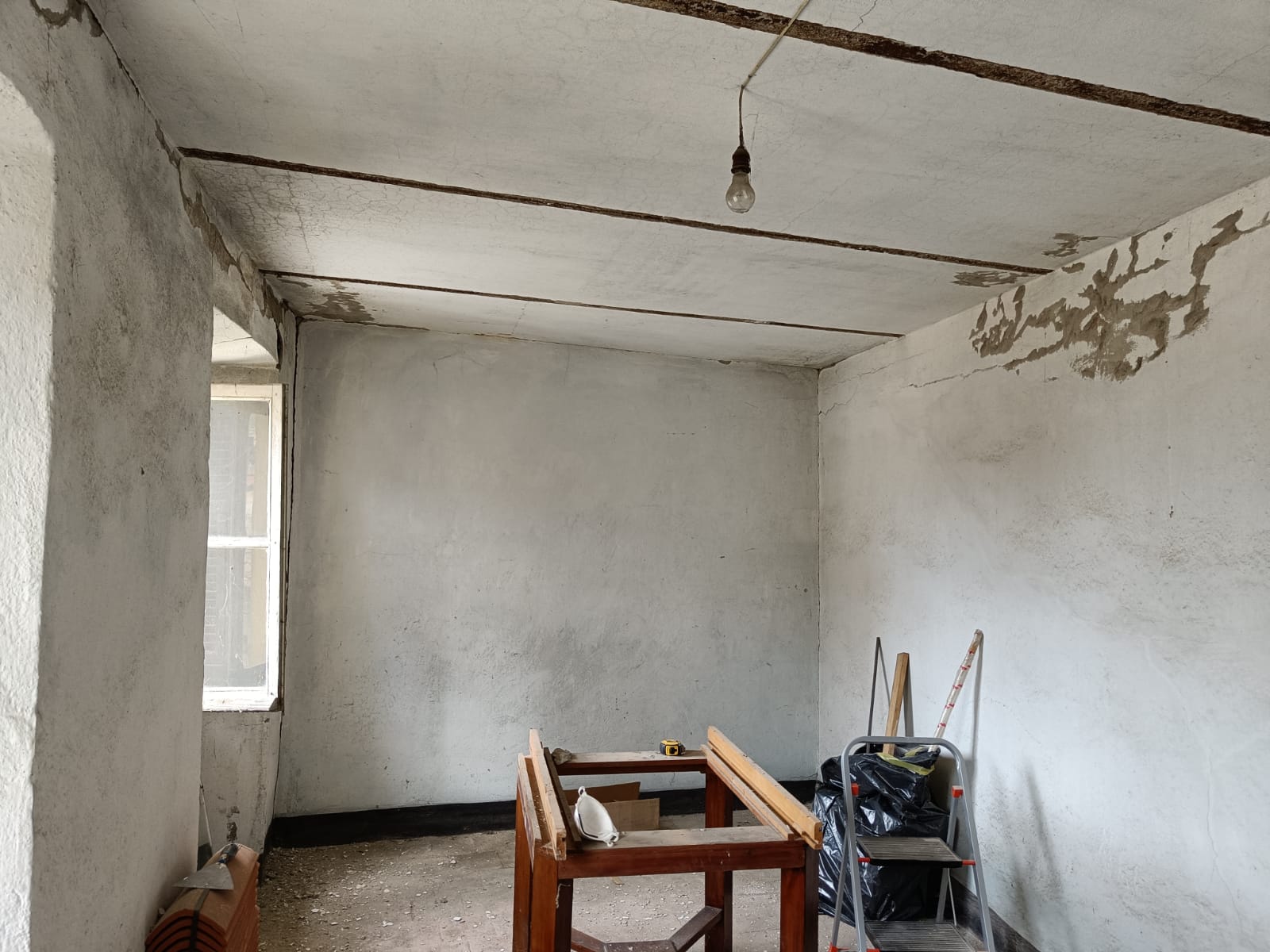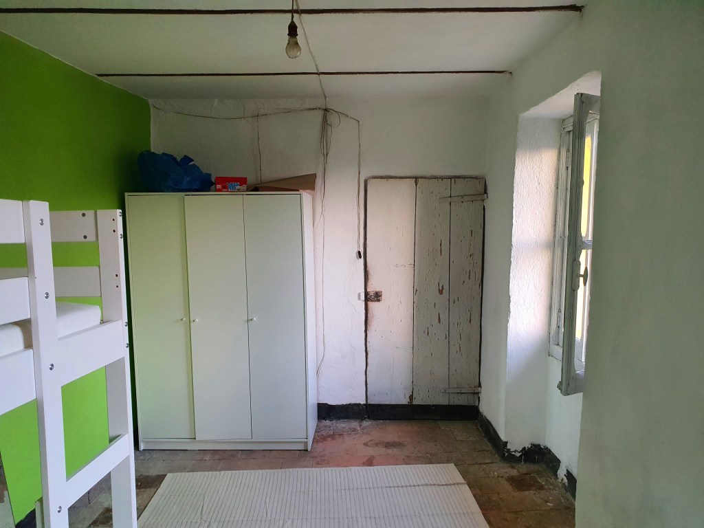 Työn alla oleva huone oli ylimmän kerroksen huoneista huonokuntoisin. Tyhjennyksen jälkeen meillä meni lähes kaksi päivää ja hirveä määrä pakkelia kaikenlaisten kolojen paikkailuun. Emme tosin ihan koko päivää ahkeroineet, muutaman tunnin aamupäivällä ennen lounasta ja sitten vielä jonkin aikaa ennen iltaruokaa. Siinä välissä asettelin Suomesta tuotuja tavaroita paikoilleen ja raivasin villiintynyttä puutarhaa.