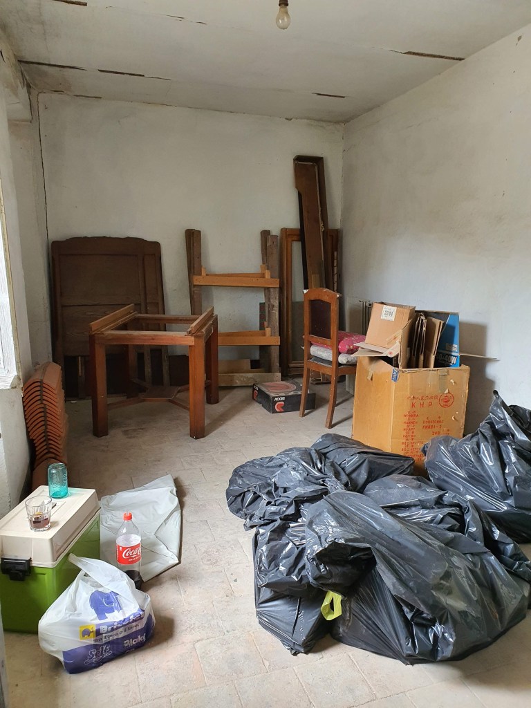 Kuten aiemmin sanottu, saimme talokauppojen yhteydessä kiitettävästi huonekaluja ja esineitä, jotka otimme käyttöön, mutta samalla ylimpään kerrokseen jäi myös ikivanhaa tavaraa, joille on saatava kuljetus pois. Kirsi Piha yleistää kirjassaan, että italialainen ei halua toisen hyötyvän tavaroistaan, vaikka ne olisivat hänelle itselleen turhia, mutta ainakin meidän naapurimme ovat poikkeus tähän sääntöön. Tavaraa on kuljetettu ylimmästä, komannesta kerroksesta alas kellariin jo niin paljon, että se täyttää yhden n. 3x3m kellarihuoneen kokonaan. Ja tämä oli meidän yhteinen sopimuksemme: saimme perushuonekalut ja hoidamme roskan pois. Pääasiassa tavara on kierrätykseen sopivaa: puuta, metallia, pahvia ja muovia. Jätimme esimerkiksi yläkertaan kolme hetekaa varasängyiksi ja kannoimme niiden lisäksi neljä alas.