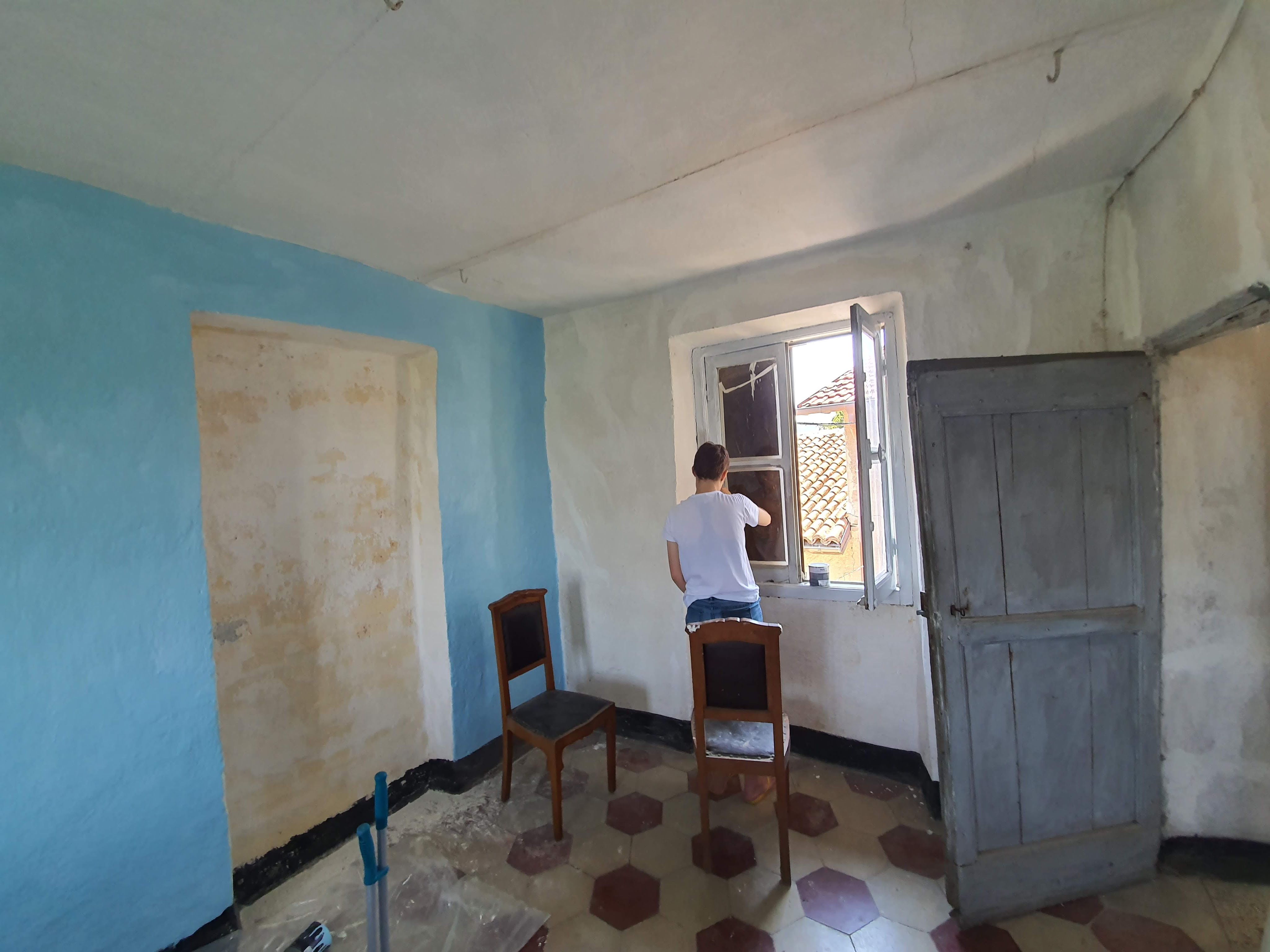 Pahimmat kohdat olivat keittiössä, mutta Kaisla korjasi ne niin taitavasti, ettei nykyisin korjauksia edes huomaa Toisena päivänä siirryimme ylimpään kerrokseen. Tyhjensimme huoneen, jossa oli vanhoja kalusteita, mattoja ja koulukirjoja. Siirsimme kaikki tavarat muihin yläkerran huoneisiin. Huoneessa harjasimme ja paikkasimme seinät, harjasimme ja maalasimme ikkunanpuitteet, maalasimme seinät, ja pursotimme silikonia ikkunanpuitteiden ja seinän rakojen väliin.